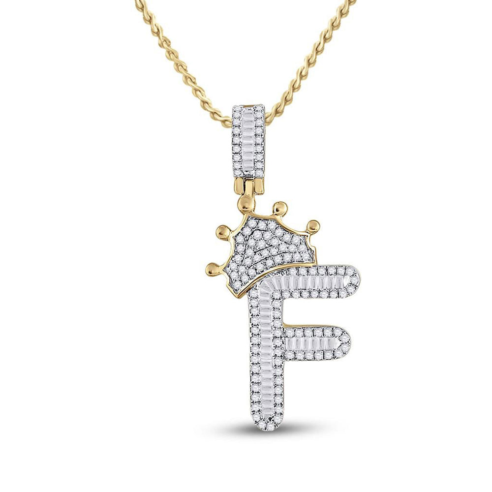Keene Jewelers 10kt Yellow Gold Mens Baguette Diamond Crown F Letter Charm Pendant 5/8 Cttw