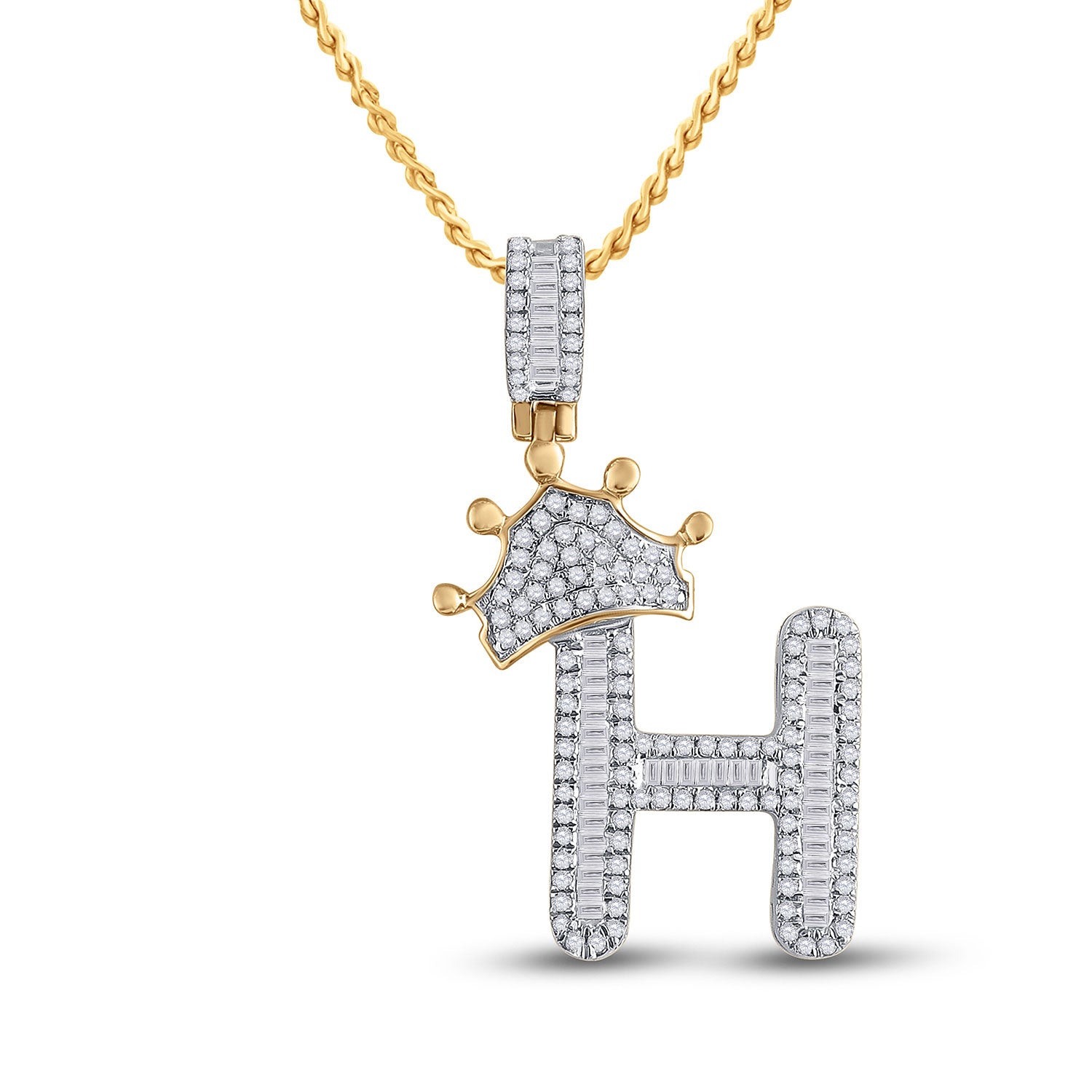 Keene Jewelers 10kt Yellow Gold Mens Baguette Diamond Crown H Letter Charm Pendant 5/8 Cttw